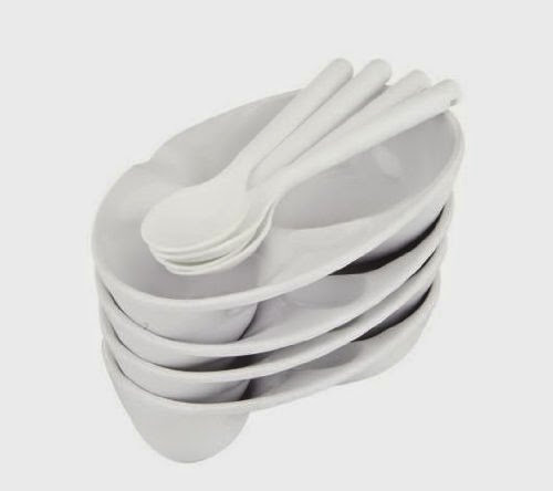 Measure and manage your munchies in these cleverly divided bowls. They are ideal for wet and dry combinations like chips and salsa milk and cereal and yogurt and granola.. Color - White. Includes four divided snack bowls and four spoons. Bowl - 0.5 cup small compartment1.5 cup large compartment. Melamine construction. Top-rack dishwasher safe. Made in China.Measurements. Bowl 9.75 L x 6.75 W x 2.75 H In. Spoon 6.5 L x 1.875 W In
